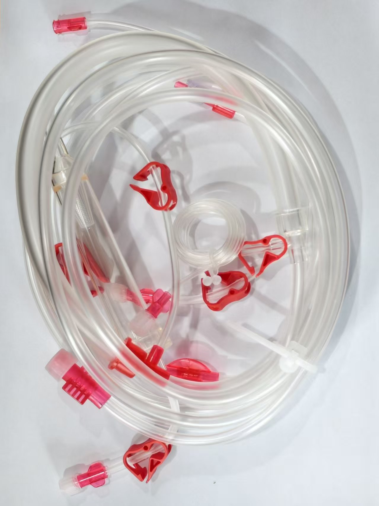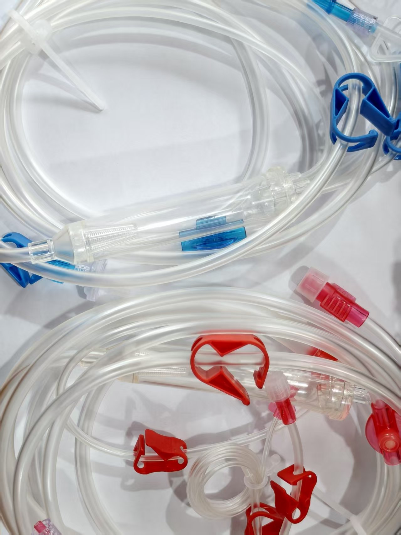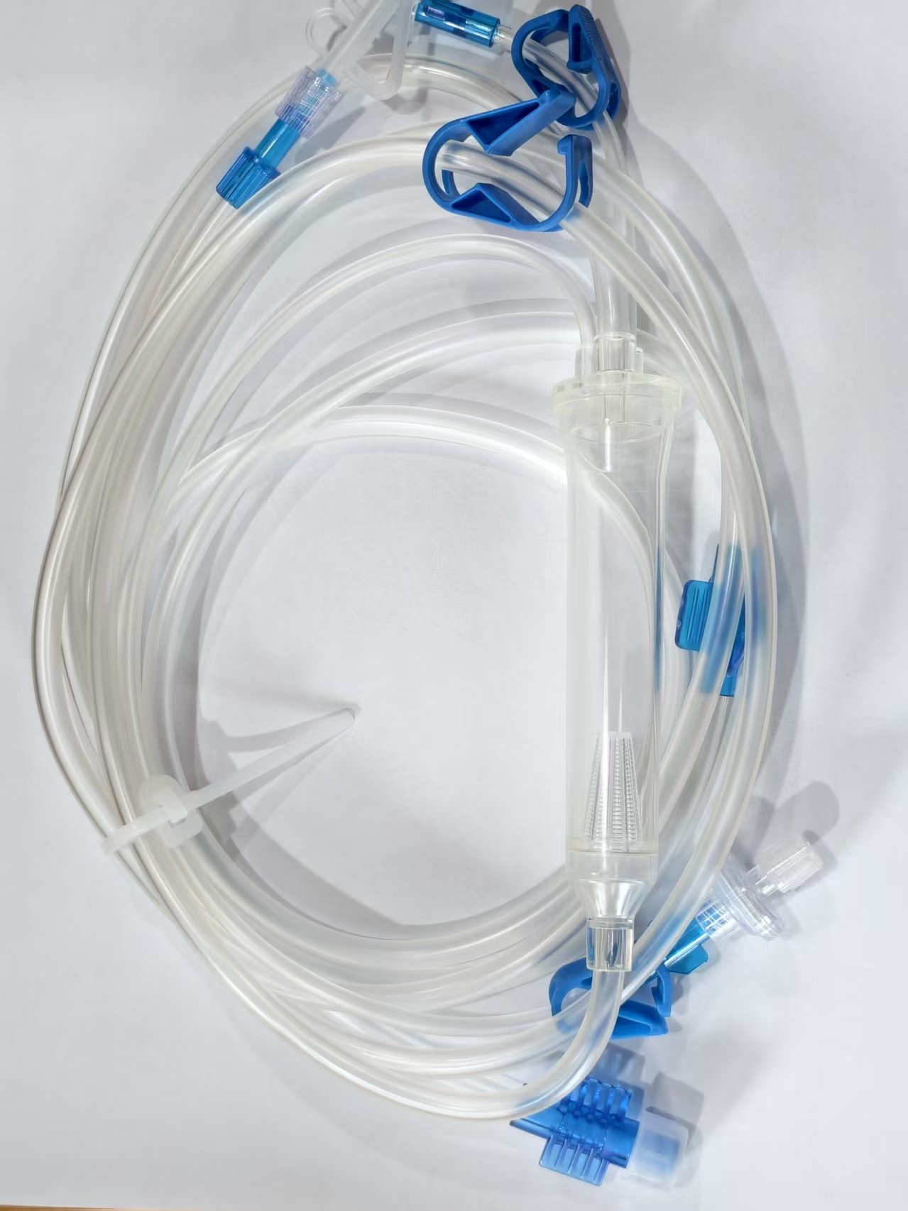 This is a disposable sterile IV infusion set—a standard medical device for intravenous fluid delivery. It includes transparent tubing, a drip chamber (for monitoring fluid flow), a roller clamp (to adjust infusion speed), and connectors (for attaching to medication containers and needles/catheters). Intended for single-use (to avoid cross-contamination), it’s commonly used in clinical settings to safely deliver medications, fluids, or nutrients directly into a patient’s vein, with its components enabling easy operation and precise flow control.