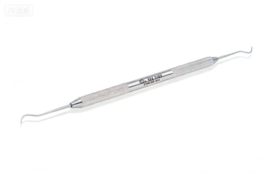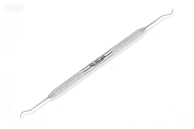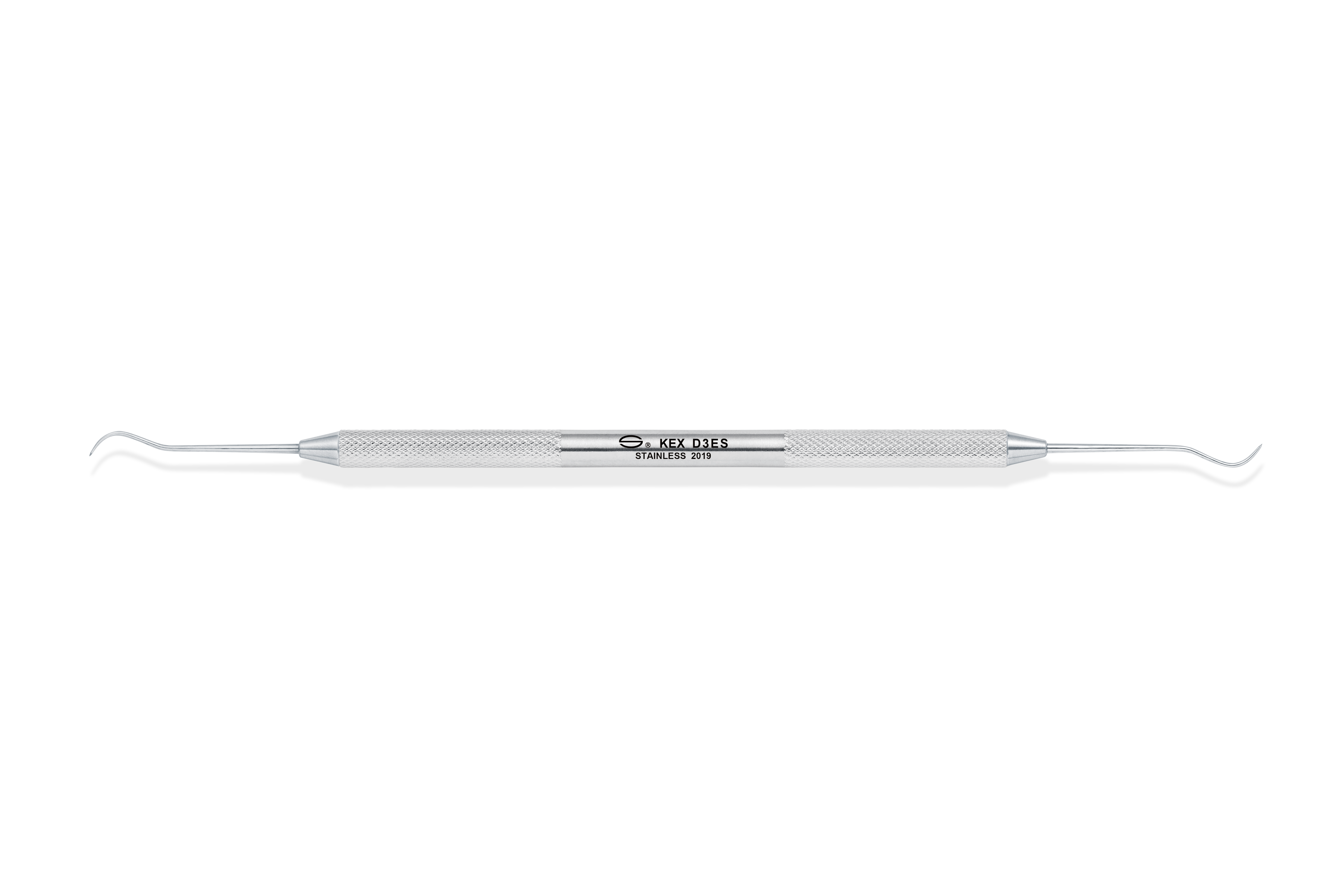 This is a professional dental instrument constructed from medical-grade stainless steel (clearly marked "STAINLESS 2019" on its body), ensuring excellent biocompatibility, corrosion resistance, and long-term durability for clinical use. Its handle features a precisely textured non-slip surface, which enhances grip stability and operational control—critical for the delicate, precise maneuvers required in dental procedures. Equipped with double-ended curved working tips (each with a tailored curvature), this tool is designed to accommodate dual functions: one tip is optimized for probing periodontal pockets (to assess gum health and measure pocket depth), while the other facilitates the removal of plaque, debris, or residual material from interdental spaces. The instrument also bears engraved markings including its model ("KEK D3ES") and a brand logo, adhering to the labeling standards for clinical medical devices. It serves as a commonly used tool for routine dental examinations and basic prophylactic cleaning procedures.