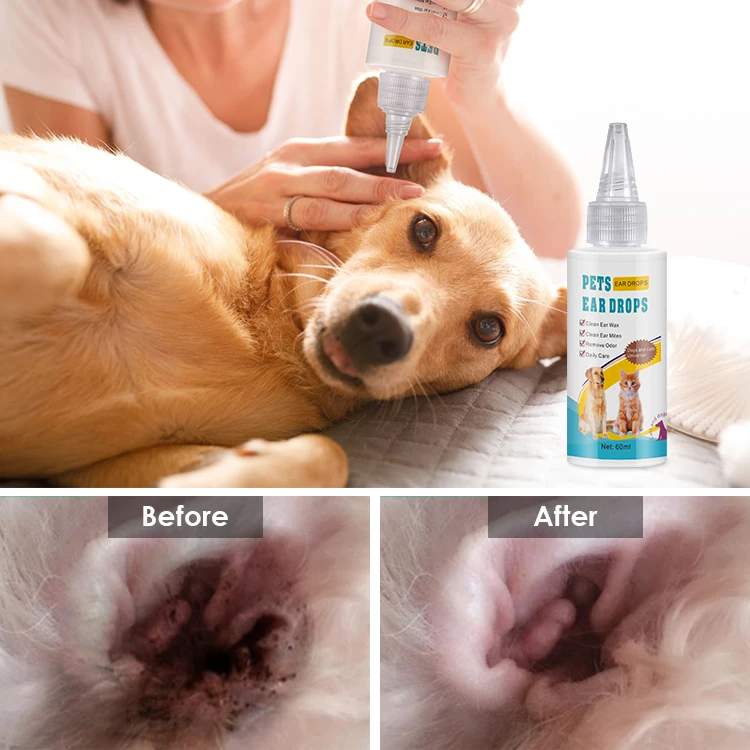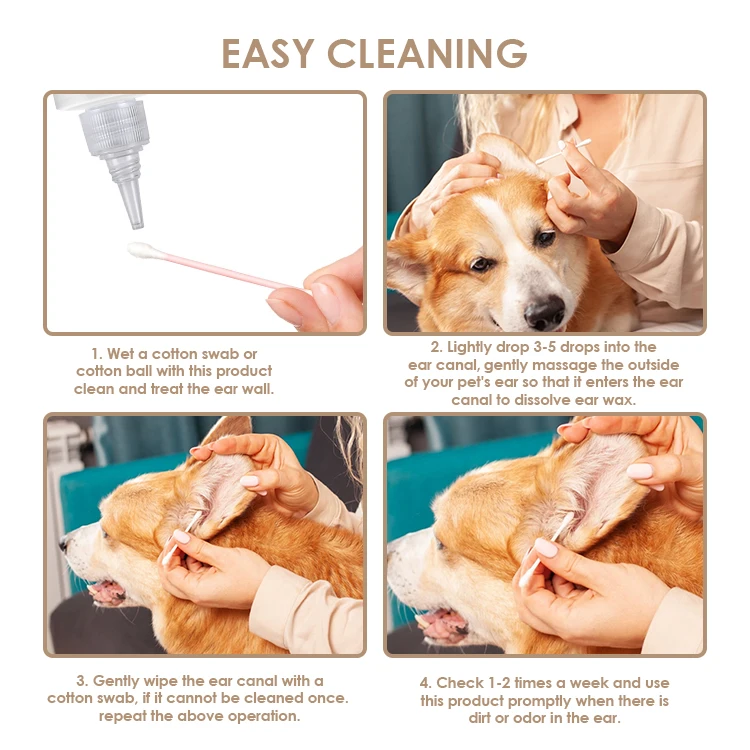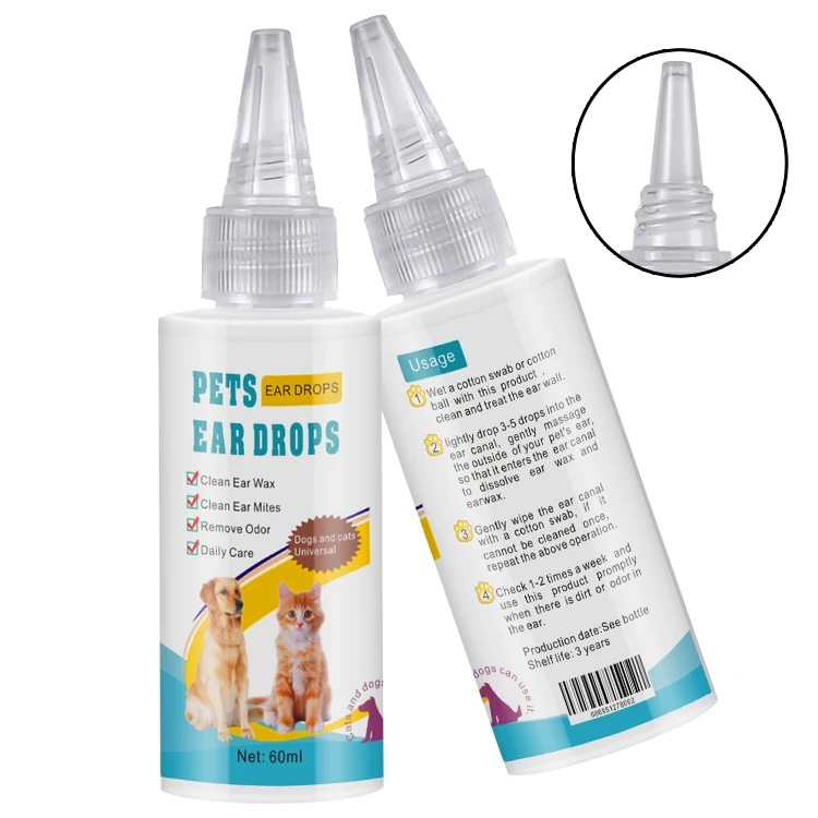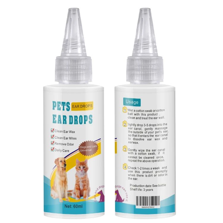 | Usage | ① Wet a cotton swab or cotton ball with this ear drops .Clean and treat the ear wall. ② Lightly drop 3-5 drops into the ear canal . gently massage the outside of your pet's ear ,so that it enters the ear canal to dissolve ear wax. ③ Gently wipe the ear canal with cotton swab , if it cannot be cleaned by one time , repeat the above opeartio. ④ The veterinarian’s recommendations should be observed. Check 1-2 times a week and use this product promptly when there is dirty or odor in the ear . |